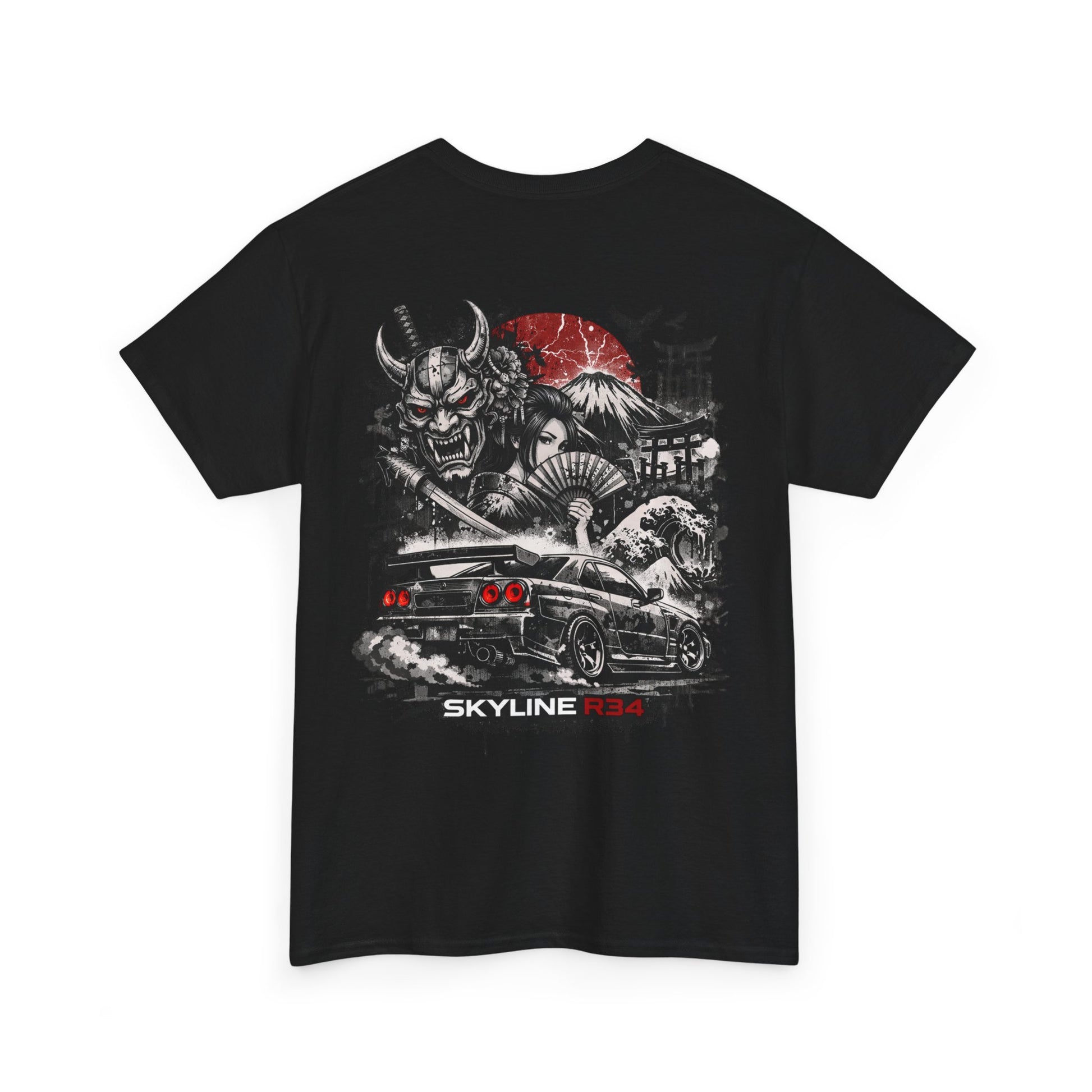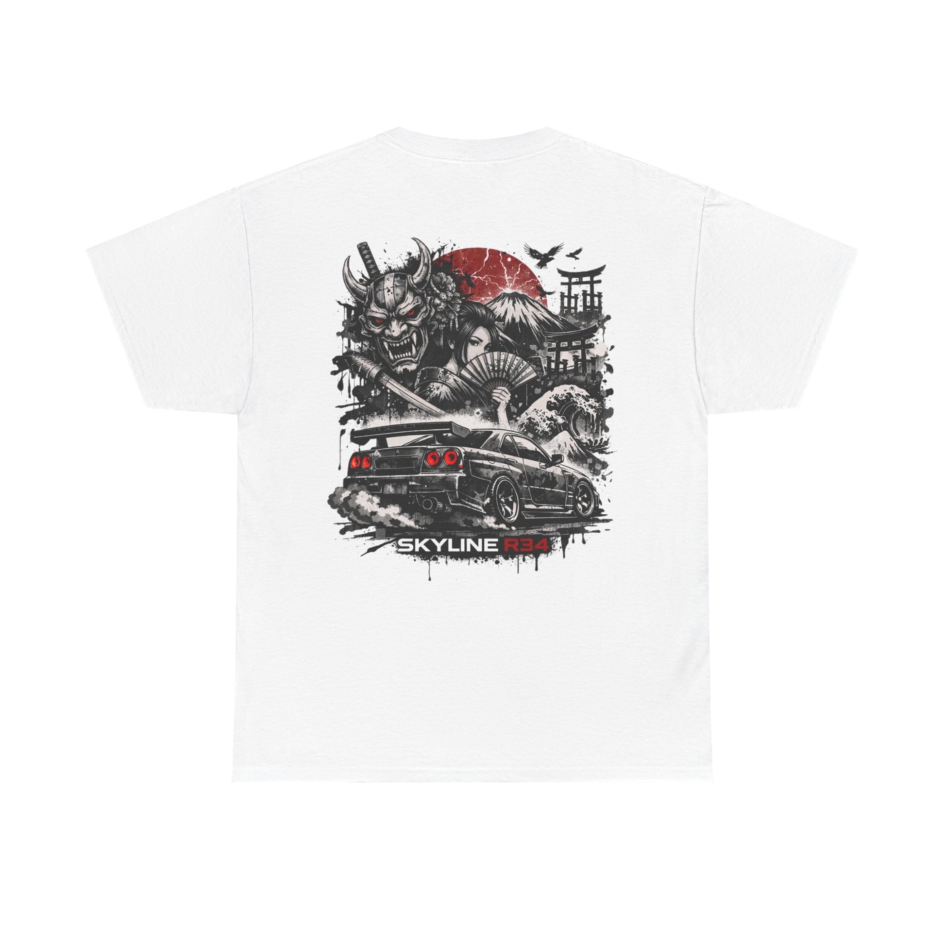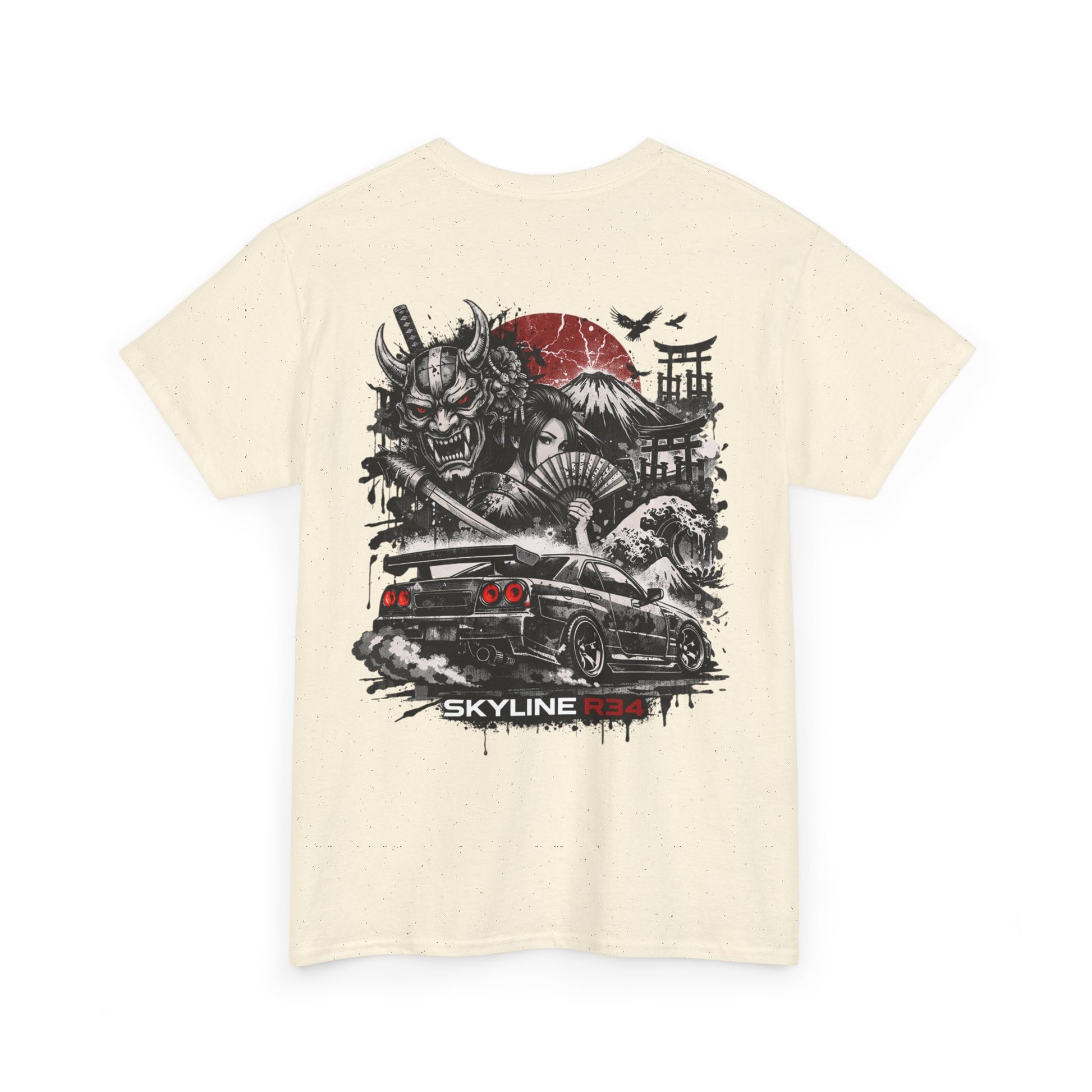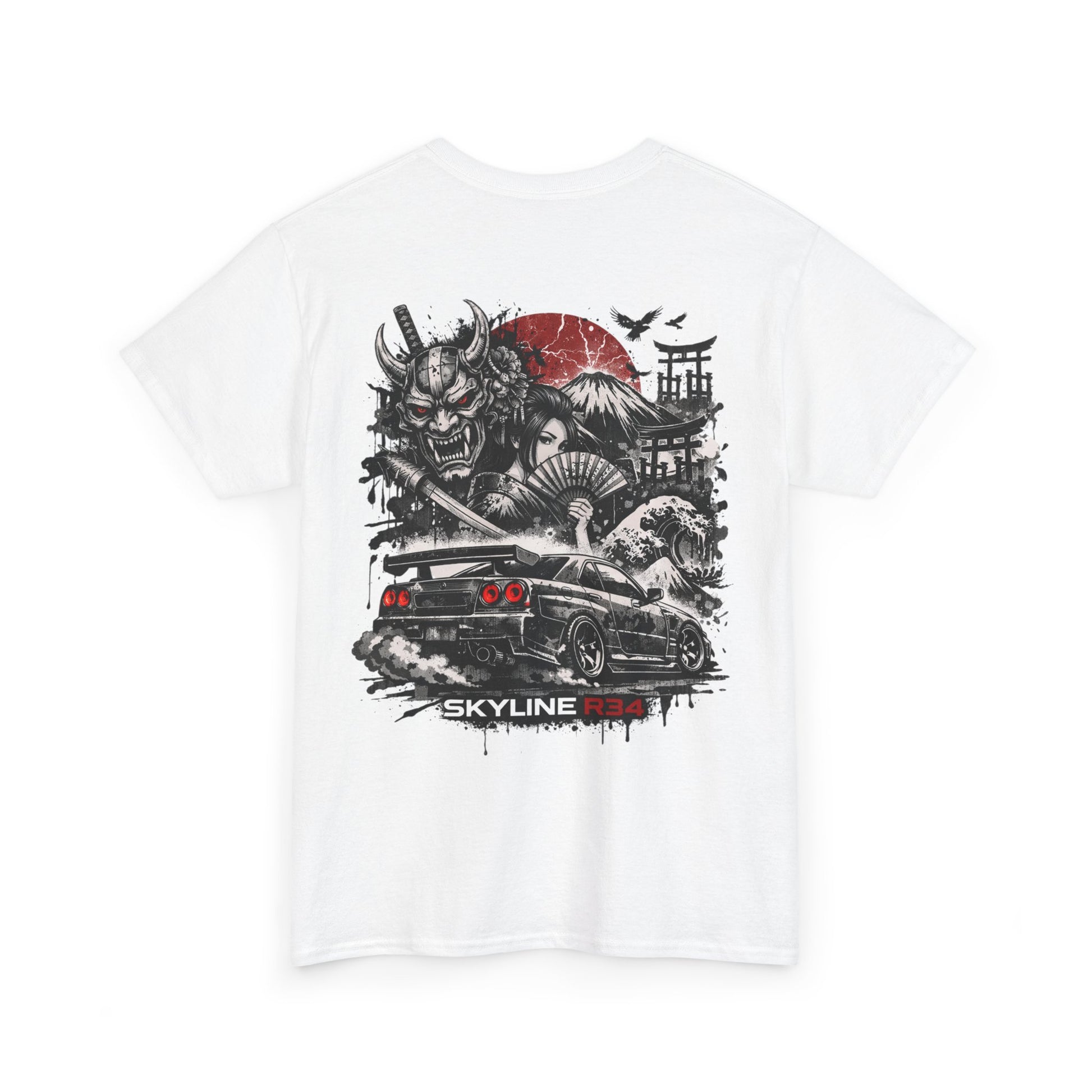 This classic cotton tee carries a raw, street-driven energy — a cinematic scene printed boldly on the back and a small emblem on the chest. The artwork blends samurai motifs, a rising-red sun, and a lowered performance car into a single graphic that feels equal parts gritty and reverent. Wear it when you want your style to say you appreciate automotive culture, Japanese-inspired design, and graphic storytelling without shouting. The fit is relaxed, the cotton feels substantial yet breathable, and the collar and shoulders hold their shape wash after wash.
